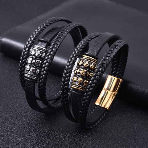 Stainless Steel Leather Bracelet, Men's Multi-Layer Genuine Leather Braided Bracelet, Artistic Retro Skull Design