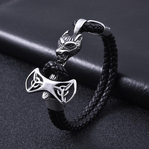 Men's Leather Bracelet, Braided Ship Anchor & Wolf Head Stainless Steel Leather Bracelet, Leather Cord, Trendy Jewelry