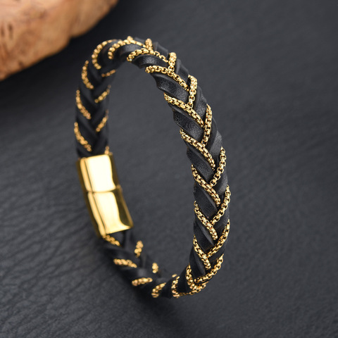 Popular Jewelry Simple Style Stainless Steel Chain Genuine Leather Bracelet Retro Punk Braided Leather Cord Bracelet for Men