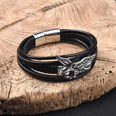 Vintage Stainless Steel Leather Bracelet with Eagle Design, Bold Multi-layer Leather Weaving, Fashionable Men's Jewelry